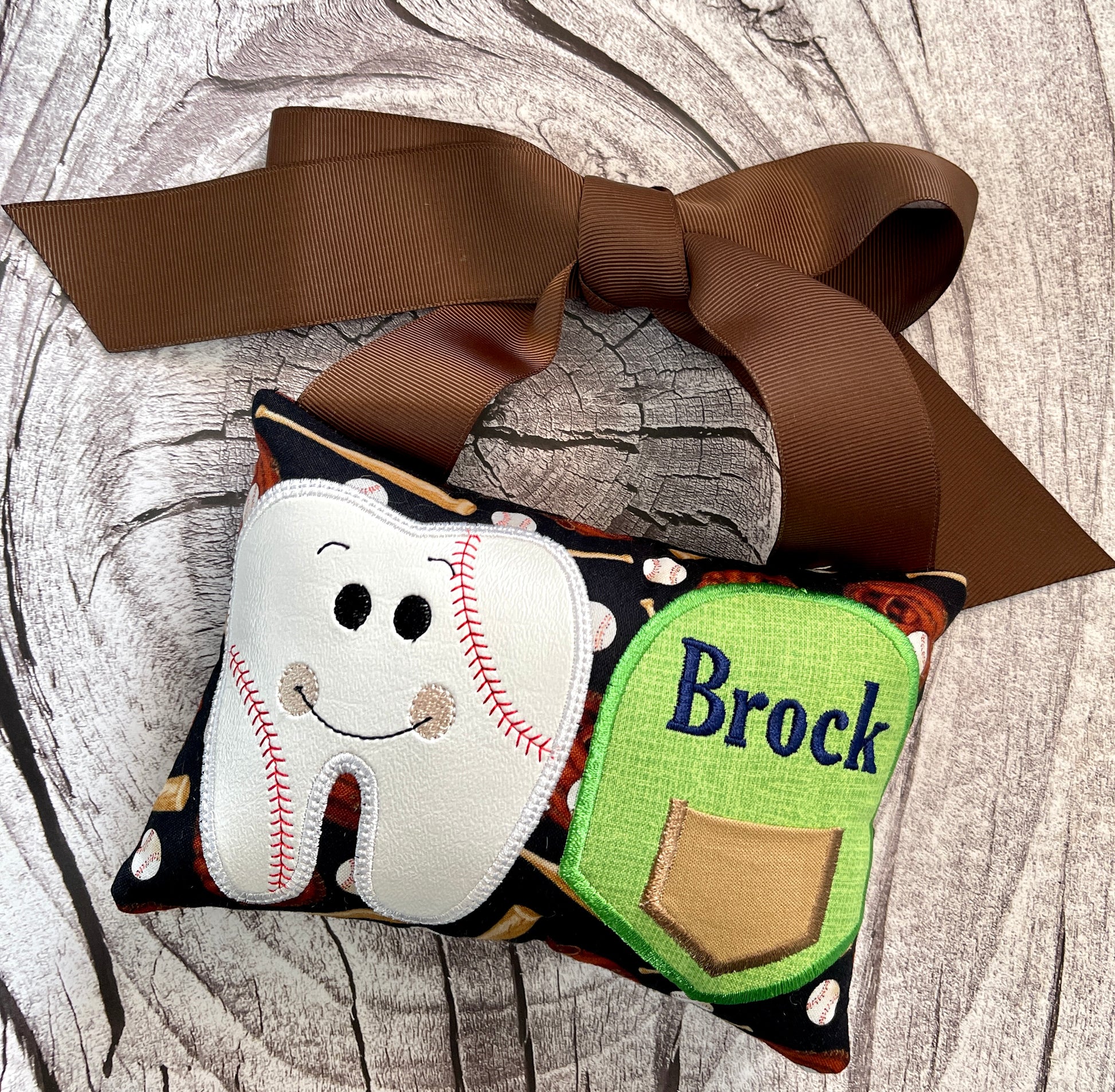 Batter Up! Baseball Cutie Tooth Fairy pillow, personalized free for your little one! The cutest way to greet the tooth fairy when that magical visit is expected! This listing is for the exact fabric design shown (marine vinyl is used for the tooth, giving it that wonderful "real" baseball look!) , if you would like a different ribbon/font color please leave your request in the comments section.